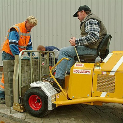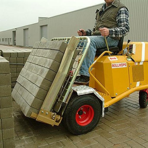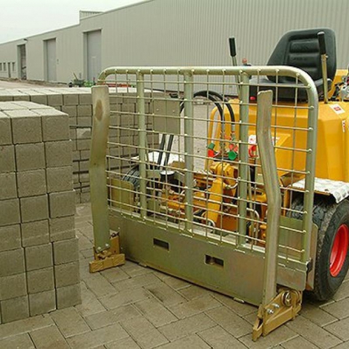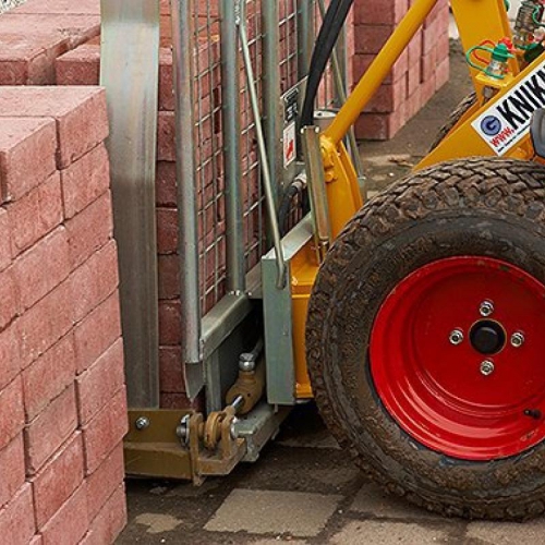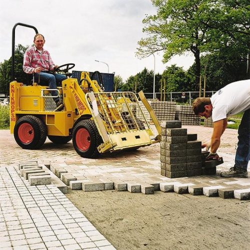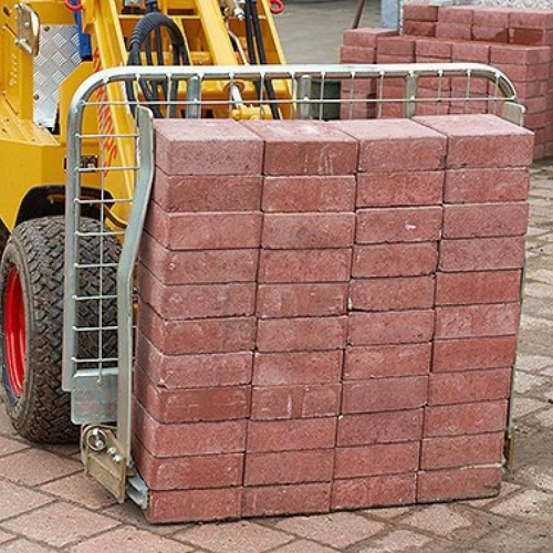 Met de stenentransportklem brengt de stratenmaker grote hoeveelheden klinkers precies waar hij ze hebben wil. De standaardklem heeft een hefcapaciteit van 500 kilo en een klembreedte van 78 tot 112 centimeter.