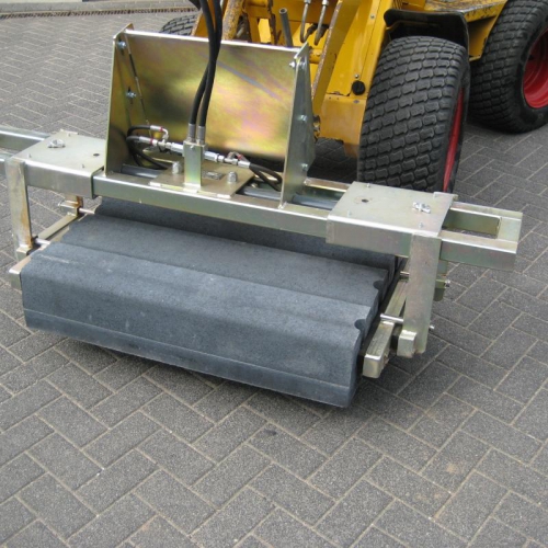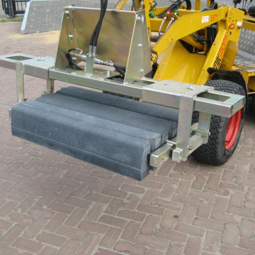 De tegel- banden transportklem wordt aangesloten op het hydraulisch systeem van de machine. Koppeling aan de machine vindt plaats door gebruik te maken van een ophangbord dat op de klem bevestigd wordt. Standaard is er een ophangbord voor aan de Knikmops gemonteerd. Door middel van de twee borgpennen is het mogelijk om de klem in verschillende standen te zetten. Extra brede voetjes van 60 cm zijn als extra optie leverbaar. Rubberen blokken in de voetjes zorgen er voor dat de tegels niet beschadigen.